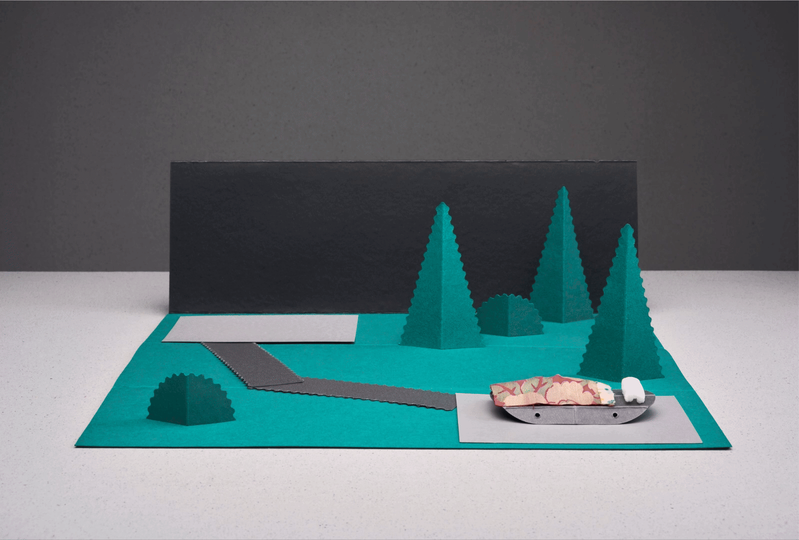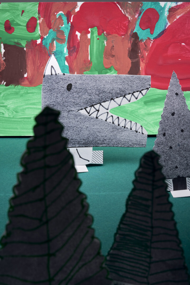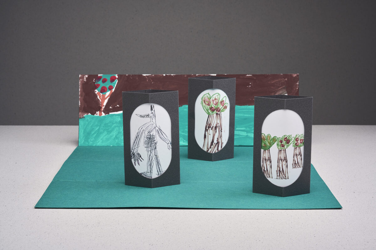 Au gré des contes, un objet aux dents pointues peut devenir loup, ogre ou sorcière, un petit cube percé de deux yeux se transforme en Petit Chaperon rouge, chevreau ou Petite poule rousse, une forme grise se fait montagne, grotte ou rocher.